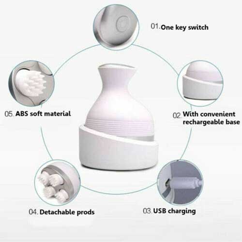 This hand held head massager has two shifting and two way rotation for comfort. The silicon massage head adopts bionic design it offers you the lowest noise. It work clockwise and anti clockwise massage direction for quick switch and each direction has 2 massage speed. It effectively promote blood circulation on your scalp to relieve and eliminate the tension and pressure. It provide a standing base with non slip pads on the bottom to enhance placement stability and the built in rechargeable battery can be directly powdered for continues enjoyment and cordless operation.