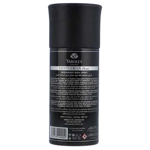 Yardley Gentleman Classic is a modern masculine fragrance opening with fresh notes interlaced with soft floral notes and resting on luxurious woody accords. This complex yet perfectly balanced body spray is perfect for the accomplished and elegant man on the go. A distinct fragrance to be worn by men and remembered by women.